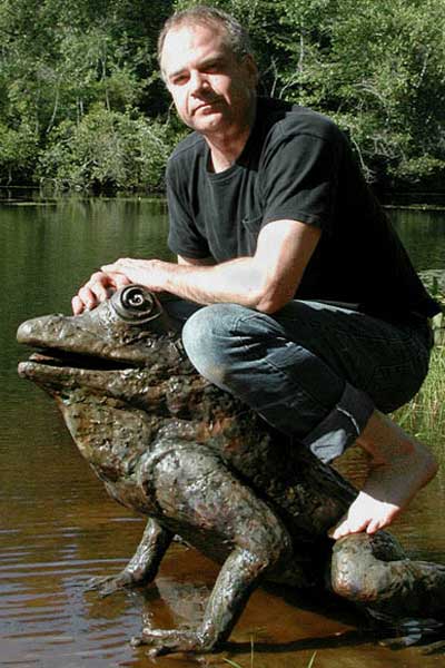 Nick Swearer is to a large extent a self-taught sculptor. His website notes that he works primarily with cast and fabricated metals in his studio/foundry located in Northeastern Connecticut. His metal work takes on a broad range of expressions, from fantastical to social narrations using human or animal characters. He first created and welded bird sculptures at the age of eleven.